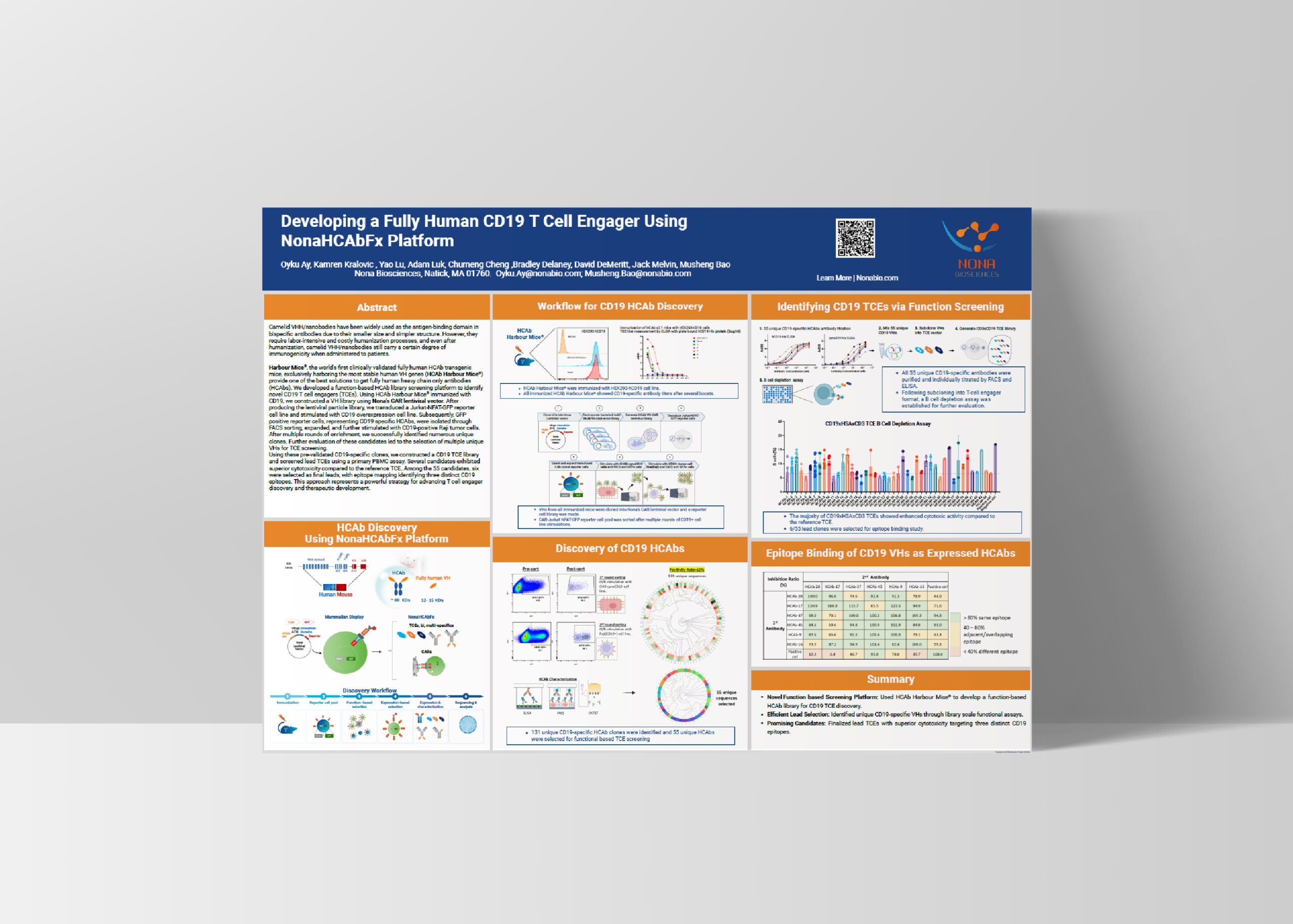 Nona Biosciences has developed a function-based screening platform leveraging fully human HCAb Harbour Mice® to accelerate discovery of CD19 T cell engagers (TCEs). This scientific poster highlights: