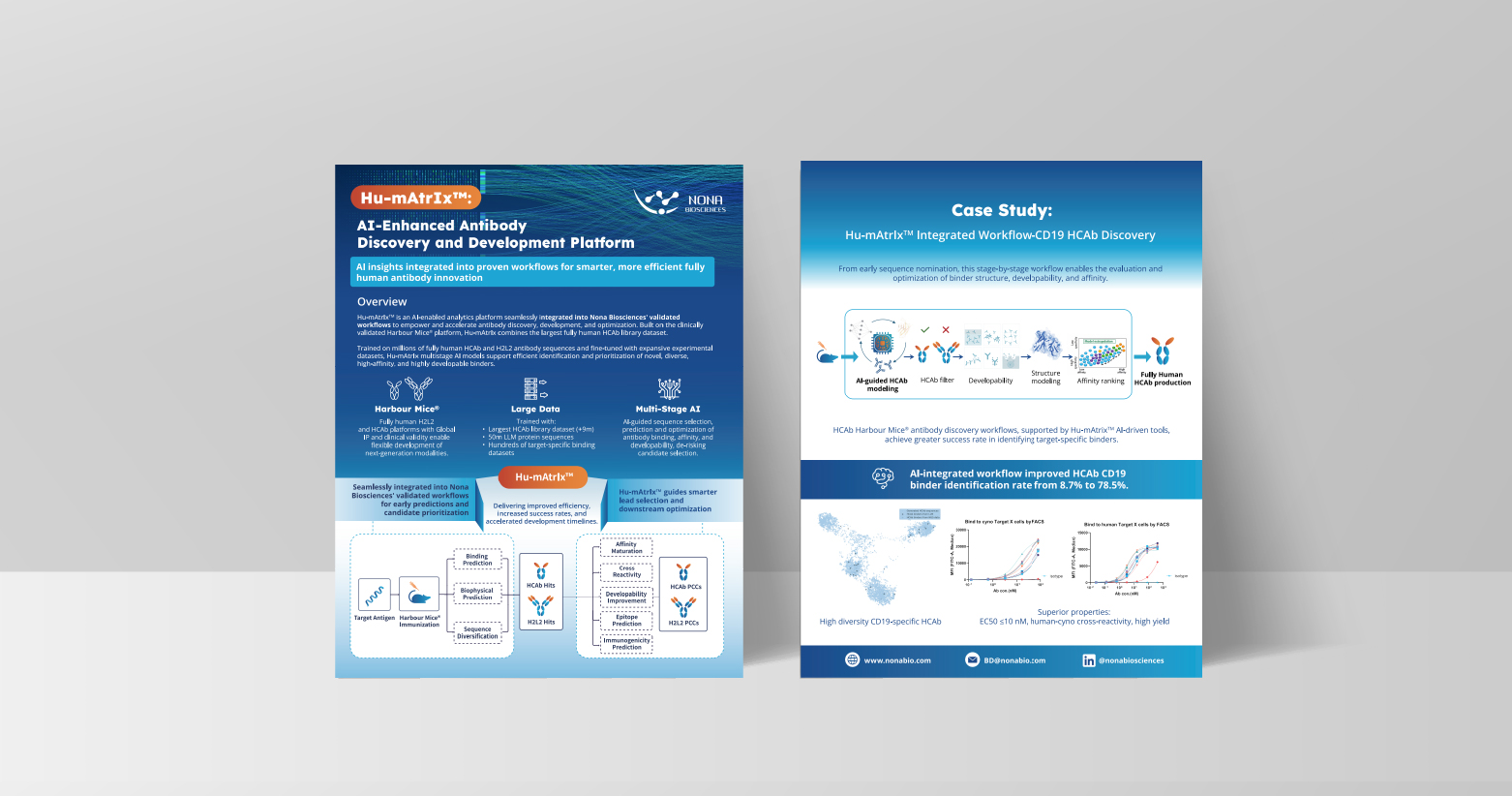 Hu-mAtrIx™ is Nona Biosciences’ AI-enabled analytics platform integrated into validated Harbour Mice® antibody discovery workflows. Built on millions of fully human HCAb and H2L2 sequences and supported by extensive experimental datasets, Hu-mAtrIx™ enhances sequence selection, optimization, and candidate prioritization.